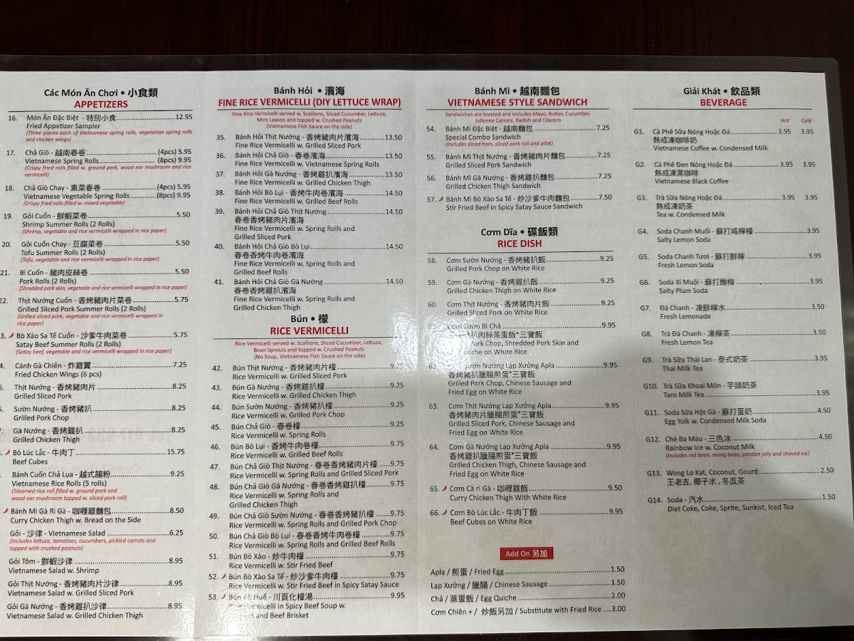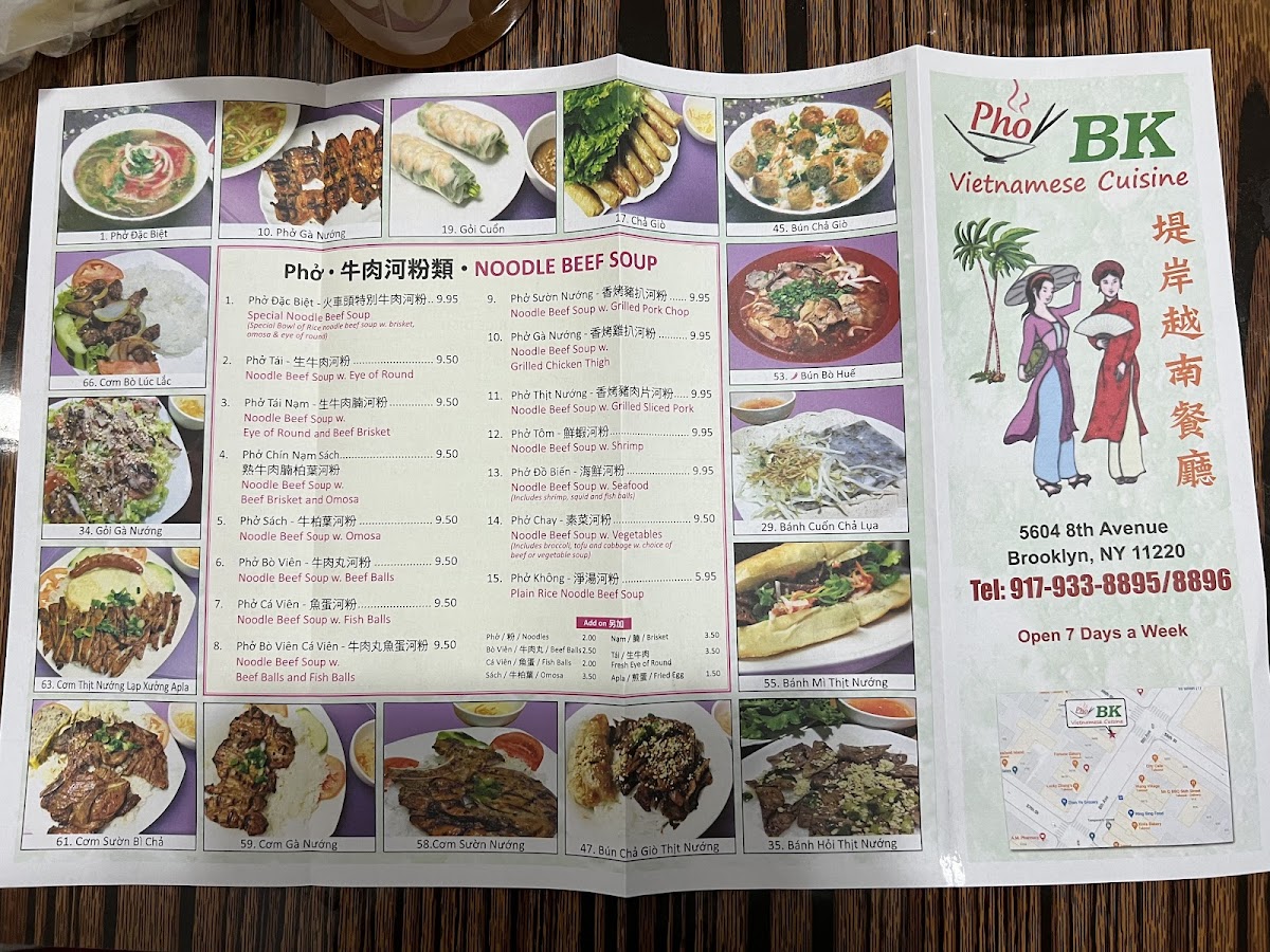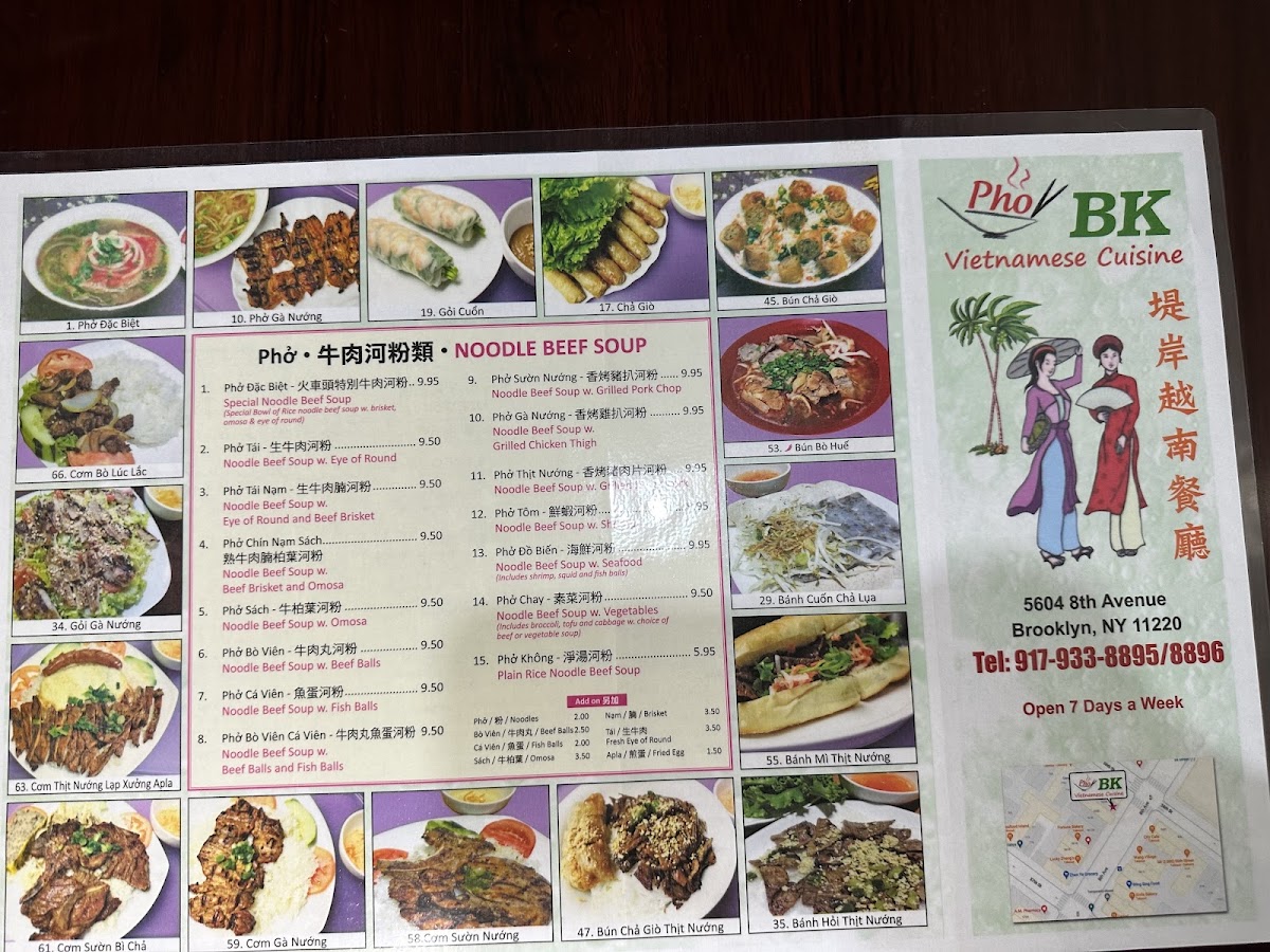 Welcome to Pho BK, a delightful hidden gem located in Brooklyn, NY, that specializes in authentic Vietnamese cuisine. This culinary hub showcases a diverse menu centered around traditional staples, particularly their savory noodle beef soups, or pho, and delicious banh mi sandwiches. Each bowl of pho is crafted with care, featuring options like the fragrant noodle beef soup with grilled pork chop and seafood variations, all priced under $12. The banh mi sandwiches, such as the Special Combo with sliced ham and pork roll, are an explosion of flavors, expertly toasted and layered with fresh ingredients for $8.75. Guests rave about the homey feel and generous portion sizes, with many noting the thoughtful service and complimentary tea. Pho BK is not just a meal; it’s an experience that transports you straight to Vietnam with every bite. Come and discover the warmth of Vietnamese hospitality!
